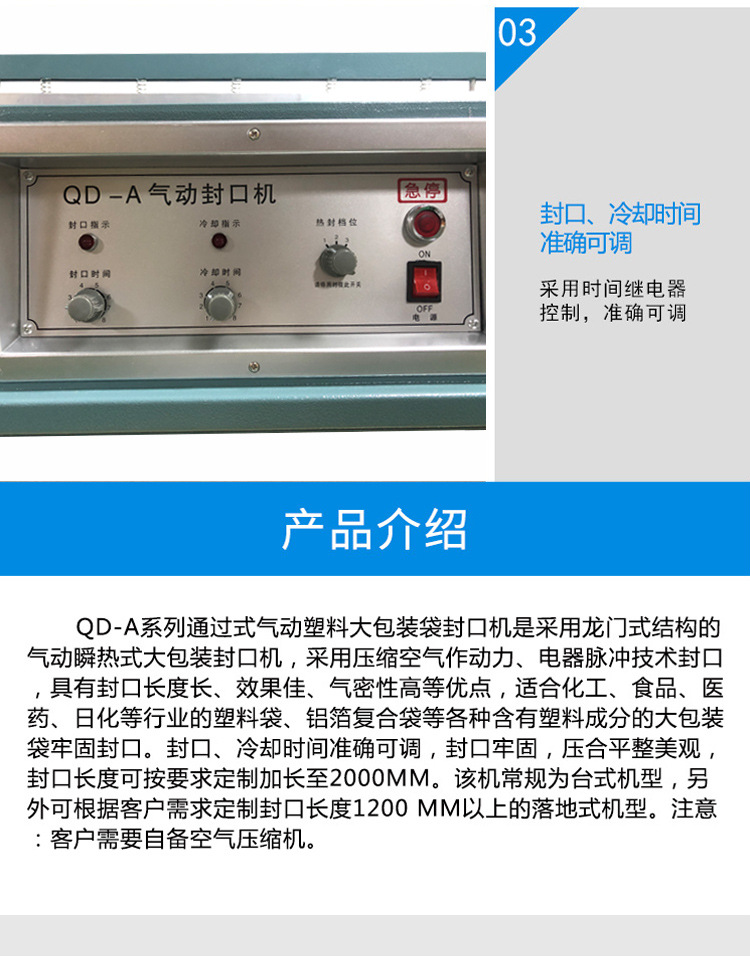 相反,當面對較厚的包裝材料,像是多層復合膜或較厚的塑料材質時,較低的氣壓無法讓封口模具有效壓緊材料,會導致封口不牢。這種情況下,需要提高氣壓,使氣缸推動封口模具產生足夠的下壓力,確保包裝材料的各個層面緊密貼合。同時,適當延長封口時間,給予加熱元件充足時間將熱量傳遞至材料內部,使內層材料也能充分熱熔,進而形成牢固且密封良好的封口。
