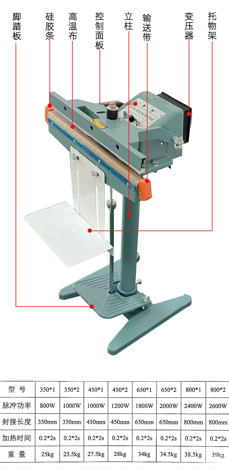 - 腳踏封口機:通常具有專門的腳踏控制機構和與之相連的傳動系統,結構上會更注重腳踏板與封口部件之間的聯動性和穩定性。為了方便操作人員踩踏,腳踏板的位置和角度一般經過精心設計,而且機身結構可能會相對較高,以適應腳踏操作的空間需求。