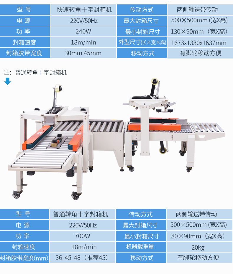 - 紙箱輸送:紙箱放置在輸送帶上,輸送帶由電機驅動,通過傳動裝置帶動滾輪或皮帶轉動,從而將紙箱平穩地輸送至封箱區域。輸送速度可通過變頻器等裝置進行調節,以適應不同的工作效率需求。