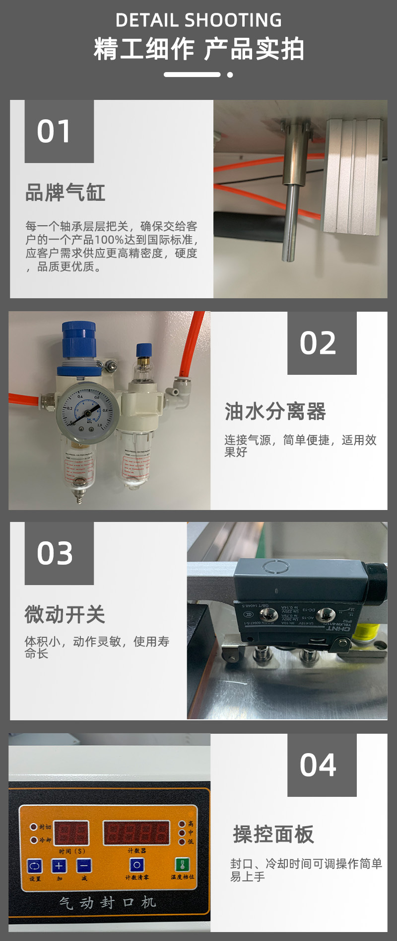 - 氣動封口機:依靠壓縮空氣作為動力源。通過氣動系統(tǒng)將壓縮空氣轉(zhuǎn)化為機械能,驅(qū)動封口部件進行封口操作。這種動力方式能夠提供較大且穩(wěn)定的壓力,適用于各種材質(zhì)和厚度的包裝材料封口。