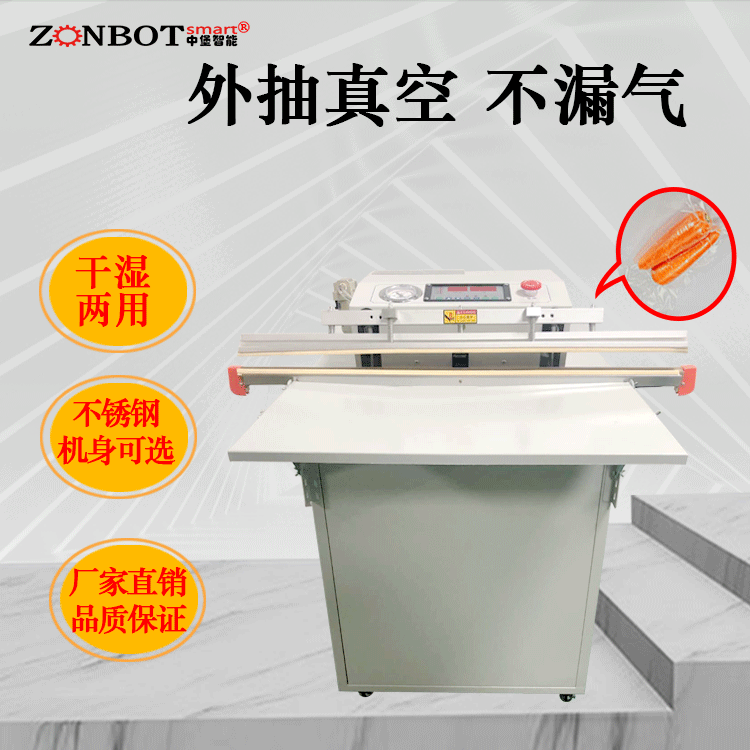外抽真空包裝機(jī)的工作原理是將包裝袋置于真空室外的工作臺(tái)上,通過(guò)抽氣嘴伸入包裝袋內(nèi),然后啟動(dòng)真空泵,抽出包裝袋內(nèi)的空氣,達(dá)到設(shè)定的真空度后,進(jìn)行封口操作,完成包裝過(guò)程。