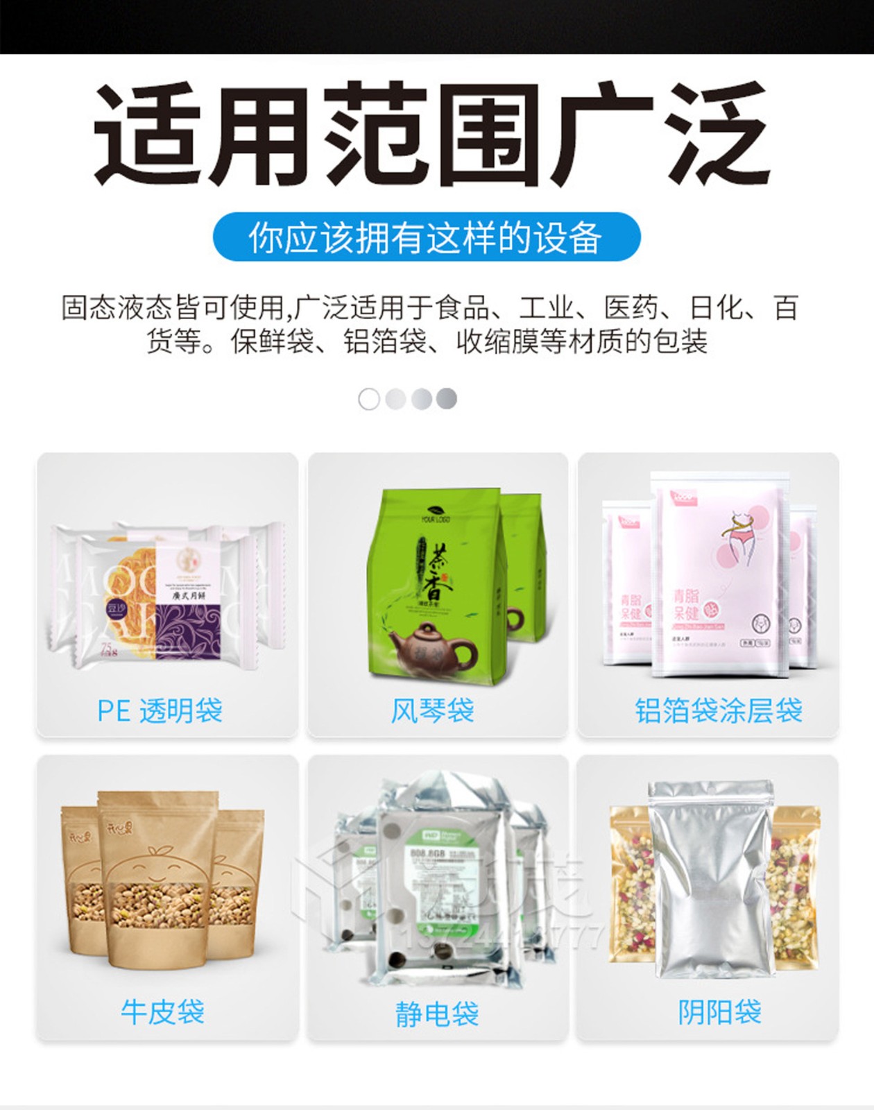 食品行業:用于袋裝零食、咖啡、調味品、堅果、干果、冷凍食品等的封口包裝,保證食品的新鮮度和衛生安全。