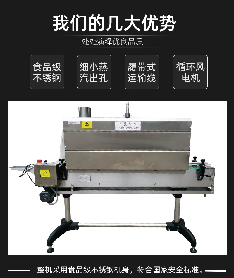 蒸汽收縮機(jī)多采用不銹鋼網(wǎng)材質(zhì),且為無級調(diào)速,輸送速度可任意調(diào)節(jié),能適應(yīng)不同包裝需求
