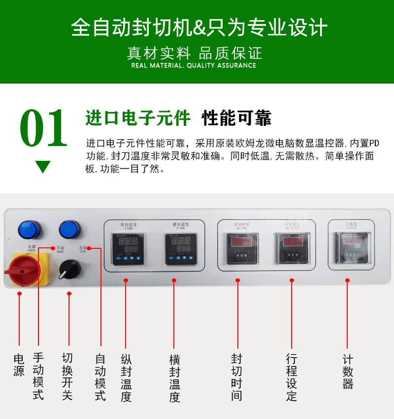 • 封切效果好:封刀采用美國杜邦特弗龍涂層抗粘耐高溫鋁合金刀,受熱均勻,不變形,封口線結實,不會開裂、焦化、冒煙,零污染,封口牢固且美觀134
