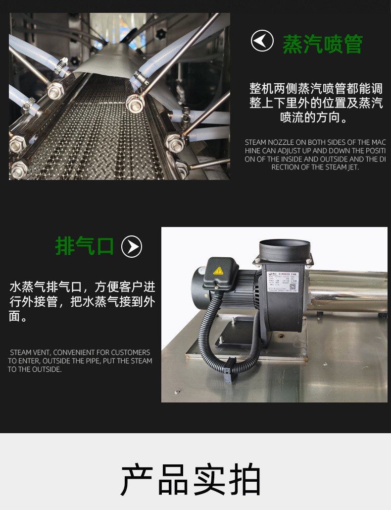 蒸汽發生器負責產生高溫蒸汽,輸送系統將待包裝的產品平穩地送進加熱室,在加熱室內,高溫蒸汽使覆蓋在產品上的收縮膜受熱收縮,從而實現包裝目的。