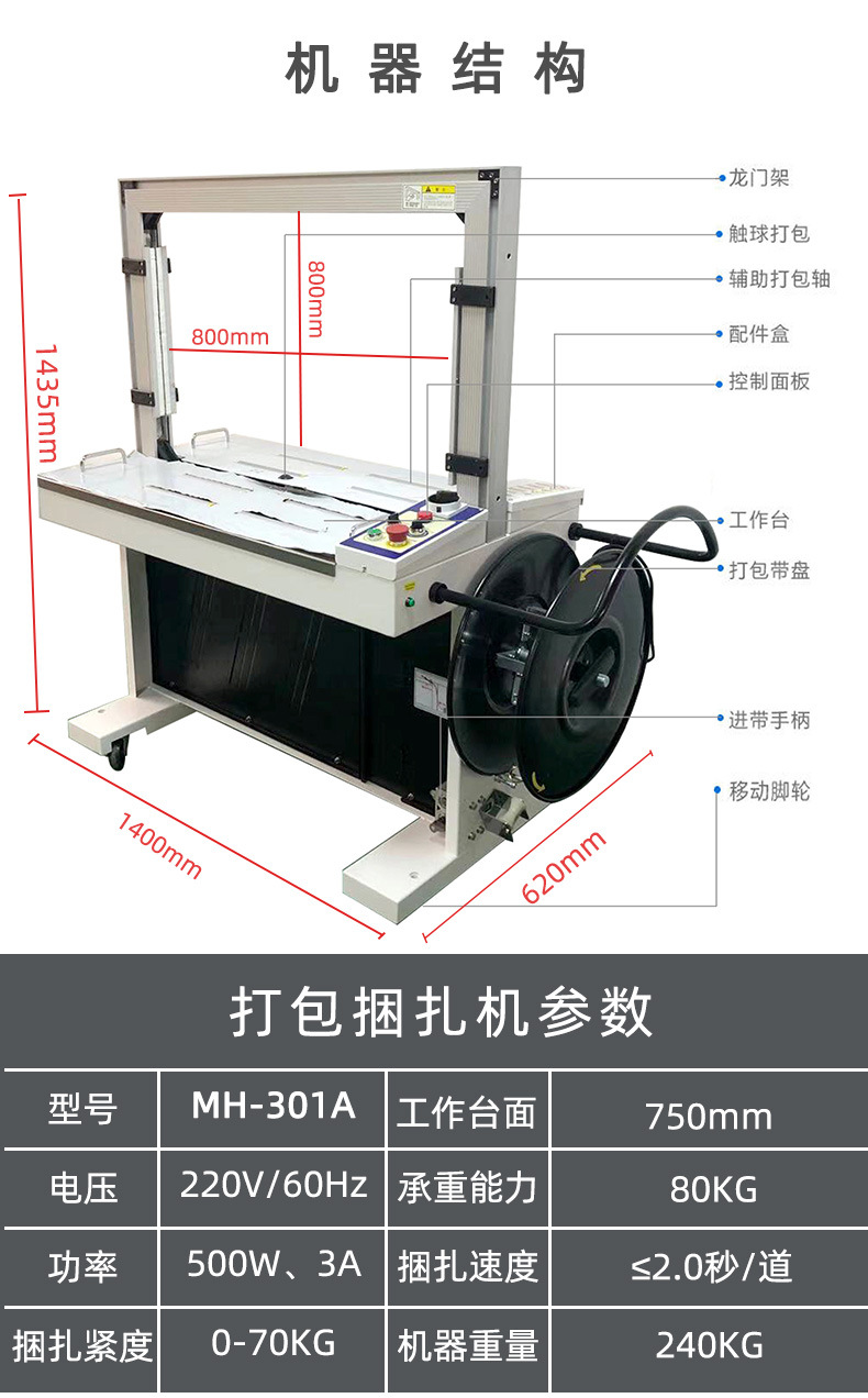- 打包機構:主要由打包帶供給裝置、收緊裝置、焊接或卡扣裝置等構成。打包帶供給裝置負責提供打包所需的打包帶,收緊裝置可將打包帶收緊到合適的緊度,焊接或卡扣裝置則用于完成打包帶兩端的固定連接。