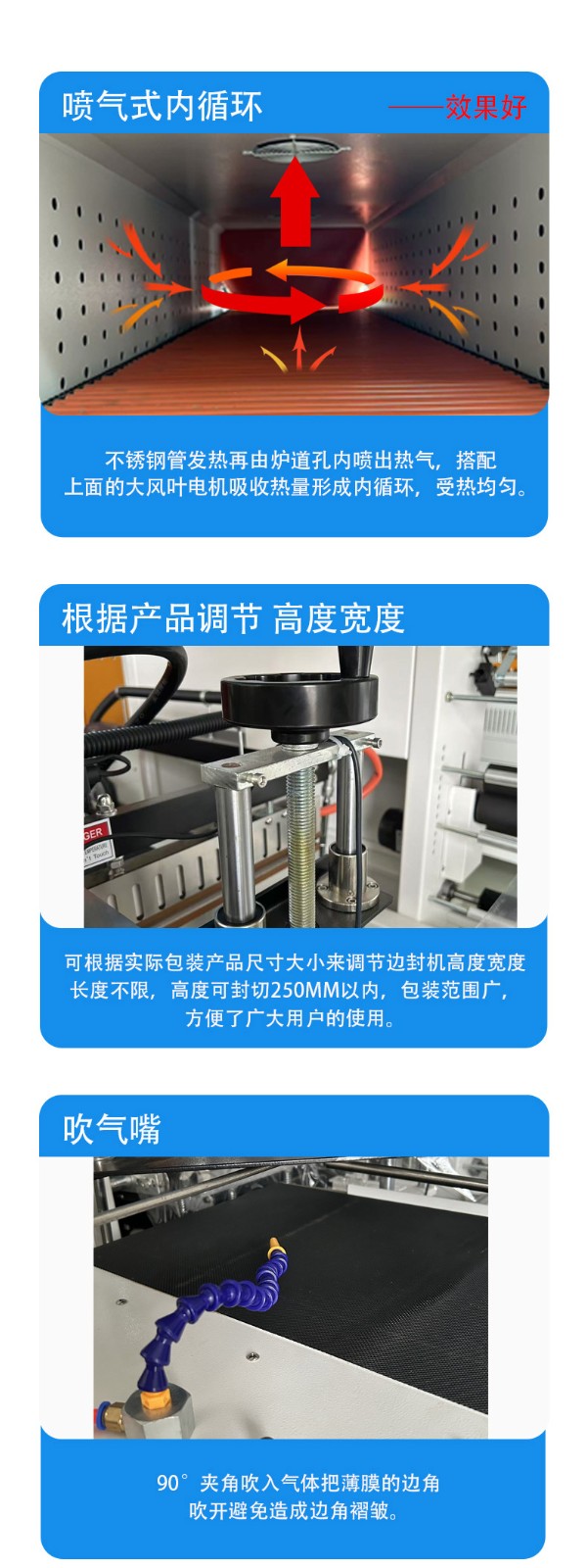 • 邊封完成后的產(chǎn)品被輸送到熱收縮通道。熱收縮通道內(nèi)的加熱元件(如電熱管或者紅外加熱裝置)開始工作,產(chǎn)生大量的熱空氣。通風裝置會將熱空氣均勻地分布在通道內(nèi),使產(chǎn)品周圍的薄膜能夠均勻受熱。