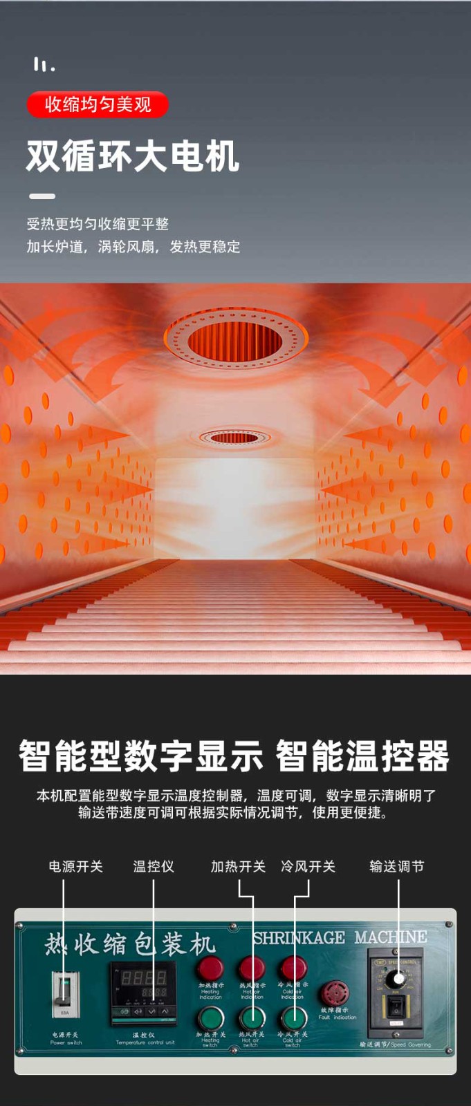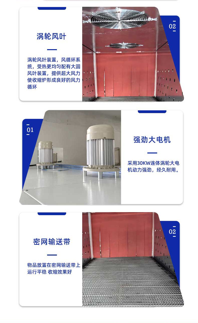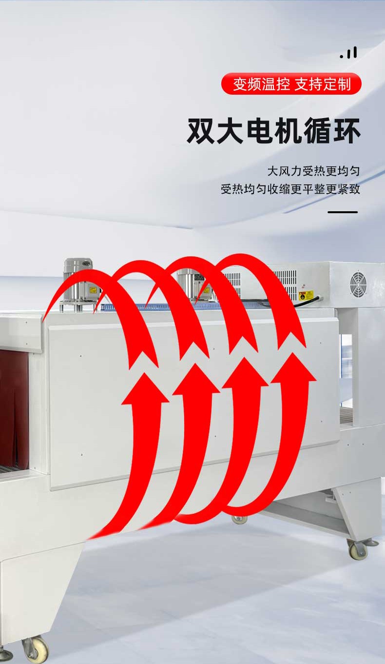 • 熱收縮定型:封切后的產(chǎn)品進(jìn)入熱收縮區(qū),這里有高溫?zé)犸L(fēng)循環(huán)系統(tǒng),使膜材均勻收縮,緊密貼合產(chǎn)品輪廓。比如有的設(shè)備采用螺旋風(fēng)道設(shè)計(jì),能有效提升收縮效率。