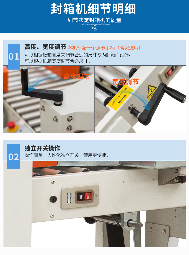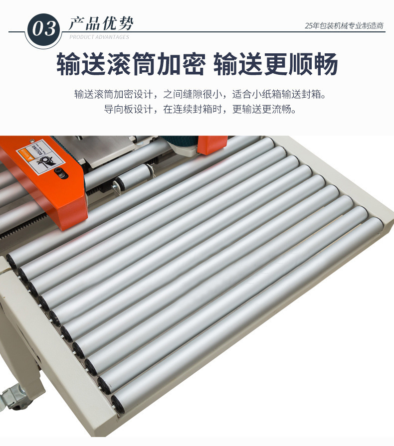為您介紹一款功能強大、操作簡便的封箱機。首先,這款封箱機采用了先進(jìn)的自動控制技術(shù),只需通過操作面板上的按鈕,即可實現(xiàn)封箱動作,無需繁瑣的操作步驟。同時,該封箱機還具備多種封口方式,如熱熔封口、膠帶封口等,滿足不同產(chǎn)品的需求。