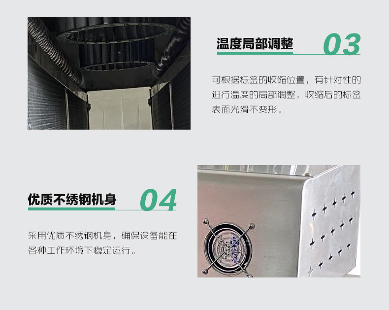 熱收縮機的主要應用領域是食品、飲料、醫藥和化工行業。在這些行業中,熱收縮機可以用于各種包裝的收縮,如瓶裝、罐裝、袋裝等 熱收縮機的功能和工作原理 熱收縮機具有送料、襯料、封切、收縮、冷卻、定型的全自動功能。熱收縮機采用國際先進的薄膜恒溫熱封技術,封口清晰牢固
