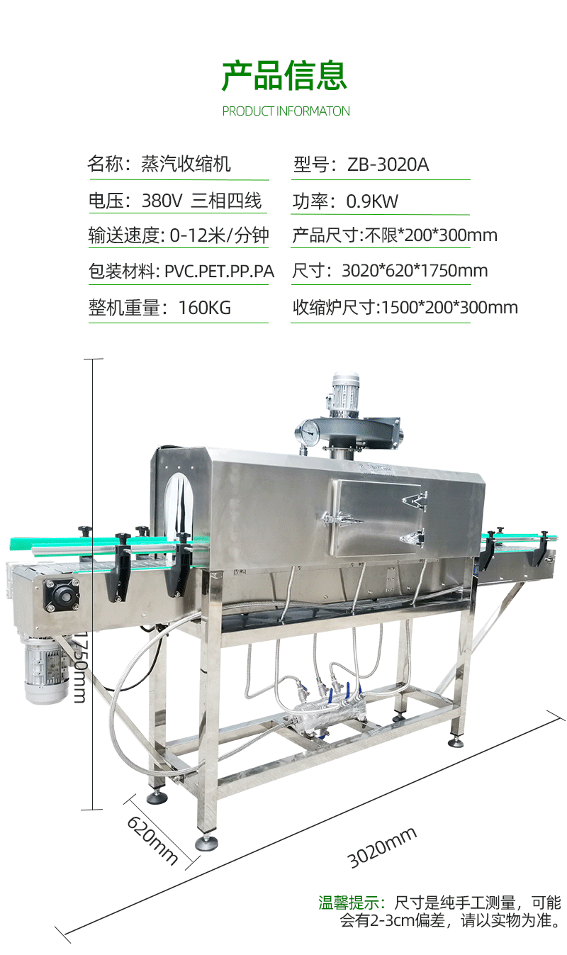 蒸汽收縮機是新一代收縮膜機,設計精巧, 外型美觀,不占空間,移動,安裝迅速快捷,超大范圍的調節,使其可適用于各種輸送帶和滑道。 主要是針對瓶狀,罐狀,桶狀杯狀產品的標簽收縮,可以收縮瓶口﹑瓶身﹑瓶底以及整體。適用于食品、藥品、化妝品、農藥等行業的玻璃瓶、塑料瓶、紙杯等容器的標簽收縮 熱縮包裝機廣泛應用于食品、飲料、醫藥、化妝品、電子產品等各個行業,是現代包裝行業中不可缺少的設備之一